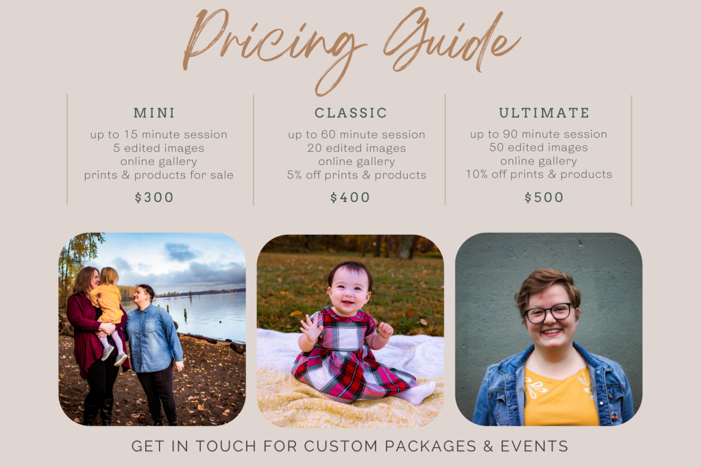 - Family photos – documentary style, lifestyle portraits that include candid shots and posed pictures in beautiful outdoor settings